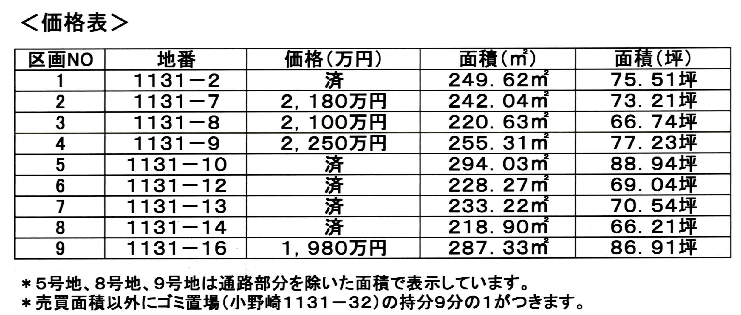 | その他 | 都市計画法第29条開発許可の取得を要します。 公営上水道の宅地内引き込み(止水栓迄)、公共下水道の本管延長、最終桝の設置は売主の費用負担で行います。 本物件は市街化調整区域につき、原則建築不可です。但し、小野崎及びその隣接大字(春日、吾妻、東新井、二の宮、松代等)に過去10年以上お住まいの方が自己用住宅の建築を条例により許可される場合がございます。 引渡は現況有姿となります。 路地状敷地区画については、通路部分は駐車不可とし、通路のみの用途に限定します。通路部分の砕石敷き、建築後のアスファルト舗装にかかる費用は、全体の3分の1をご負担いただきます。(所有面積による按分はありません。所有面積に関わらず各自3分の1負担となります。) |