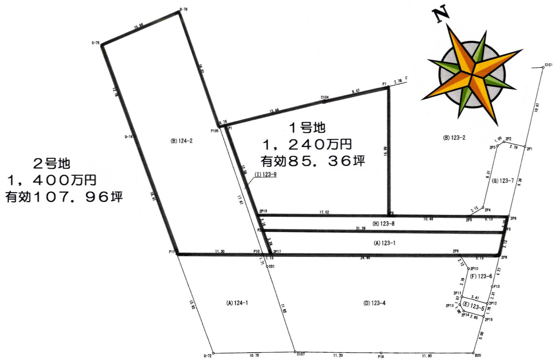 | その他 | 区域指定地内 都市計画法第29条開発許可、農地法第5条転用許可を要します。 現況は公道から物件が低くなっていますので、盛土が必要となります。 設備は公道にある本管からの取り出し、延長を要します。 共用通路部分は2区画が建築後、売主にて舗装をします。 2号地には電柱、支線の建柱が必要となります。 |