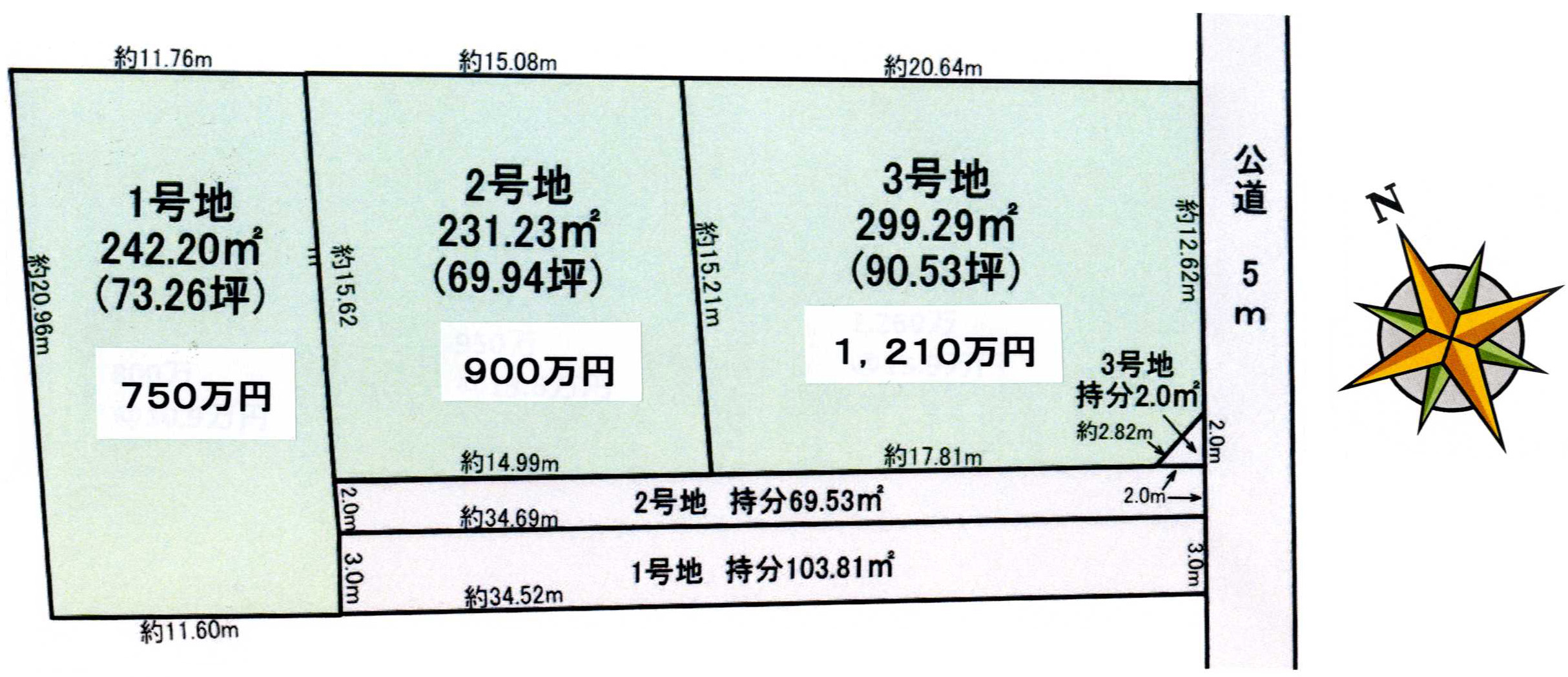 | その他 | 区域指定地内 都市計画法第43条建築許可要。 共用通路は所有権の有無に関わらず、駐車、工作物の設置、通路としての用を妨げる行為はできないものとします。 3号地の売買面積 宅地部分299.26㎡+すみきり部分2.0㎡の合計301.26㎡ |