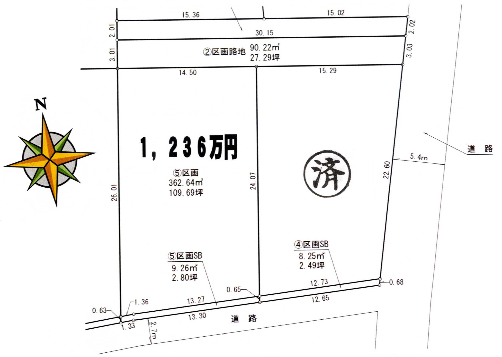 | 道路 | 東側約5.4m公道、南側約2.7m公道 | 飲用水 | 公営上水道 |