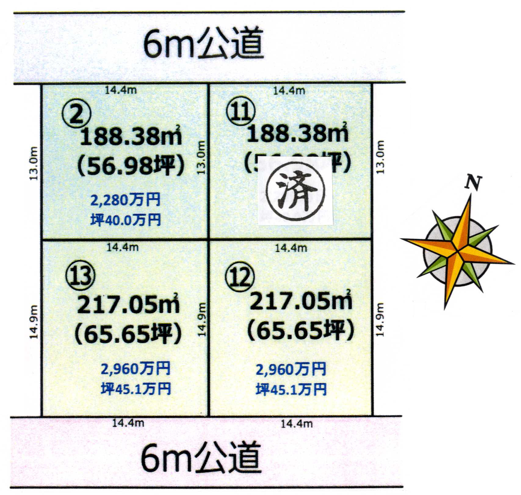 | 道路 | 北側6m公道に約14.4m接道 | 飲用水 | 公営上水道 |