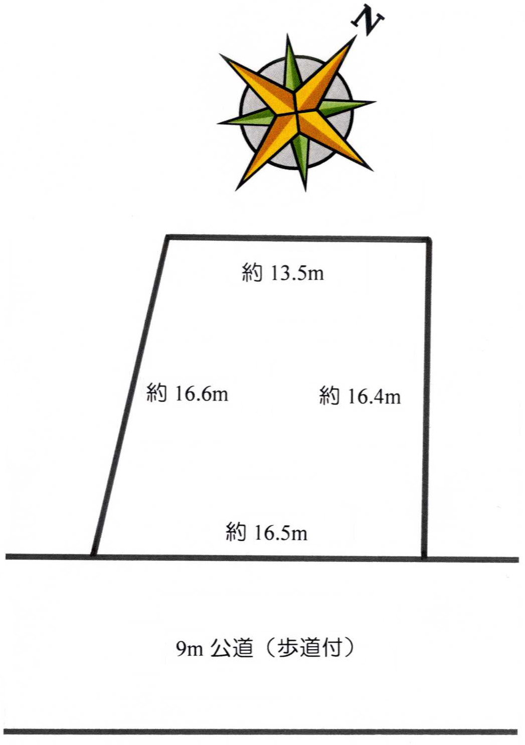 | 道路 | 東南側9m公道(歩道付き)に約16.5m接道 | 飲用水 | 公営上水道 |