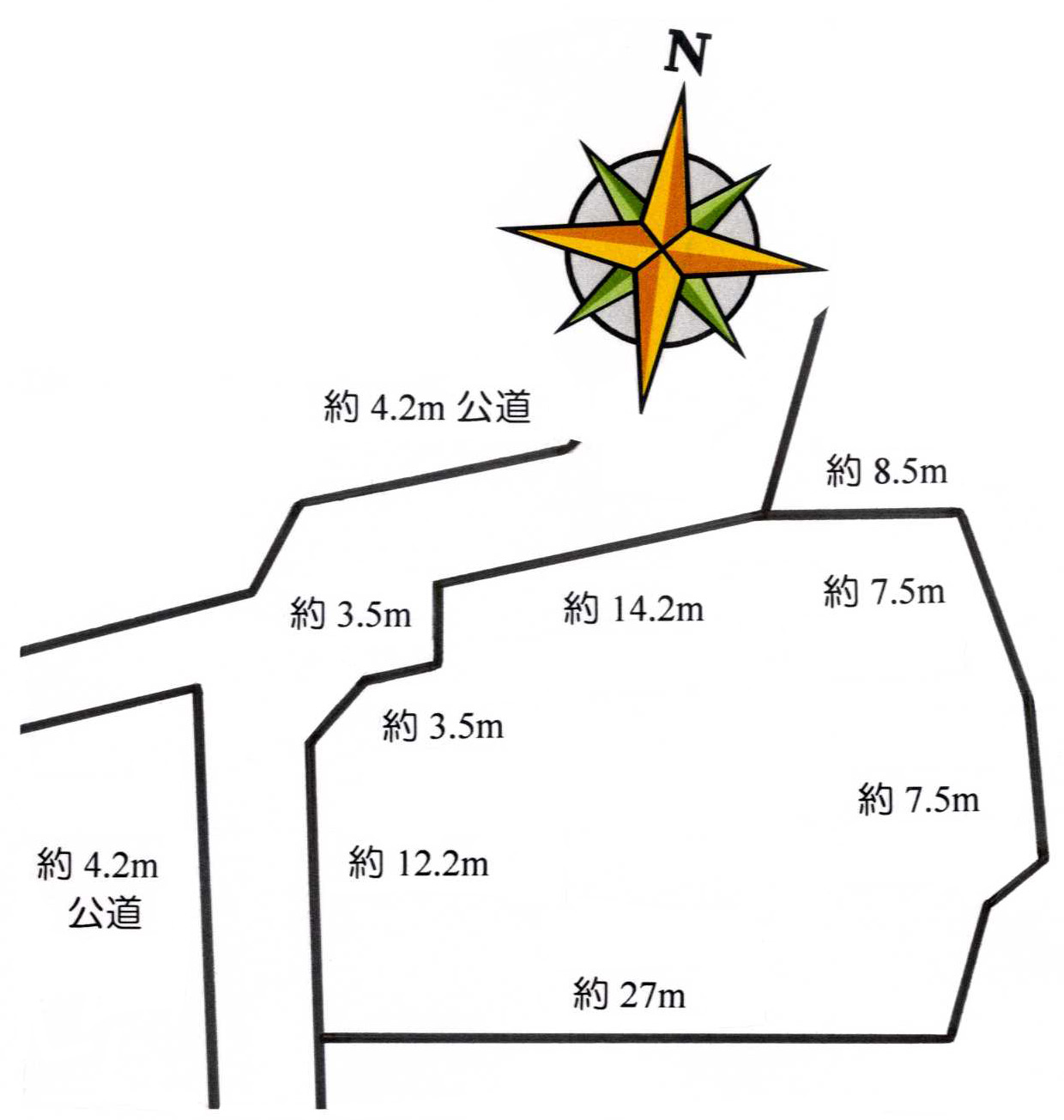| 道路 | 北側約4.2m公道、西側約4.2m公道 | 飲用水 | 公営上水道 |